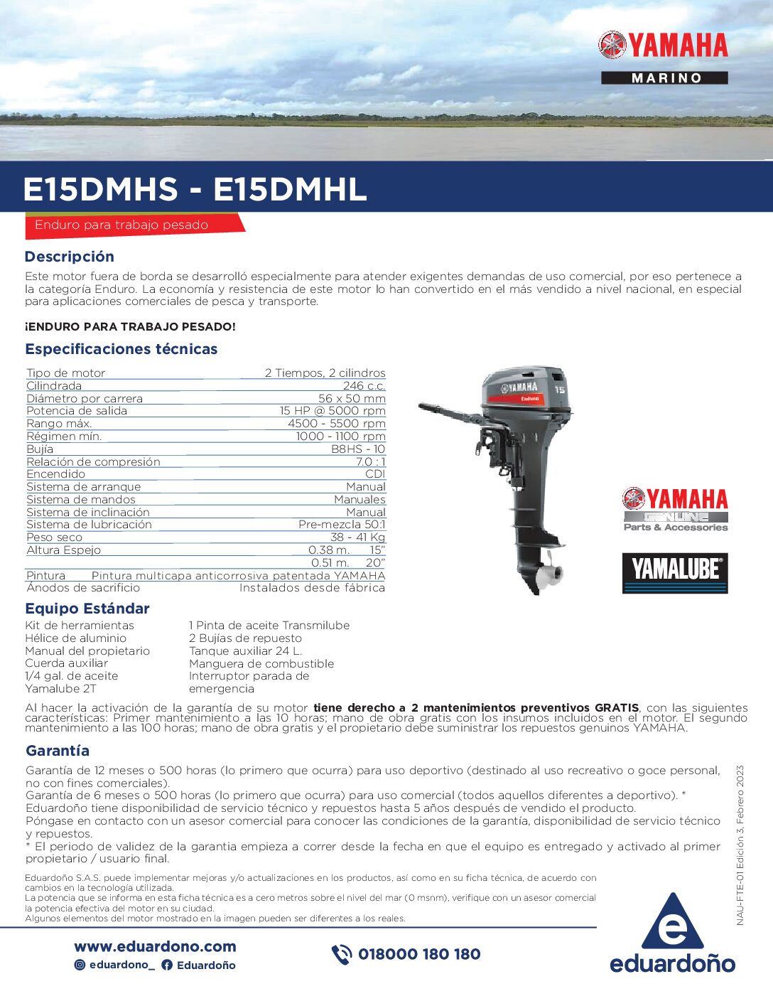 MOTOR FUERA DE BORDA E15DMHL 2T LARGO / BRAZO / HELICE ALUMINIO